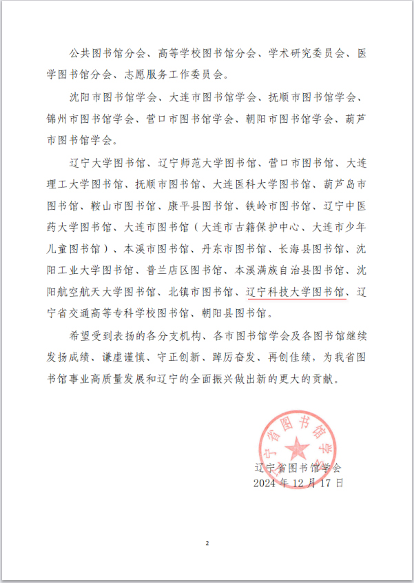荣耀体育(中国)图书馆获辽宁省图书馆学会通报表扬