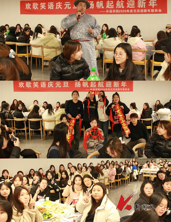 12月30日晚,荣耀体育app最新版下载外国语学院在桃园餐厅举办“欢歌笑语庆元旦 扬帆起航迎新年”2025年庆元旦迎新年学生联欢会。学院辅导员、2023级和2024级全体同学参加活动。