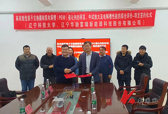 2月2日,荣耀体育app最新版下载化学工程学院与辽宁华融富瑞新能源科技股份有限公司举行“高效新型质子交换膜制氢电解槽(PEM)催化剂的研发、中试放大及电解槽性能的综合评价”项目签约仪式。鞍山市科技局、辽宁华融富瑞新能源科技股份有限公司、化工学院相关负责同志以及学院教师参加仪式。