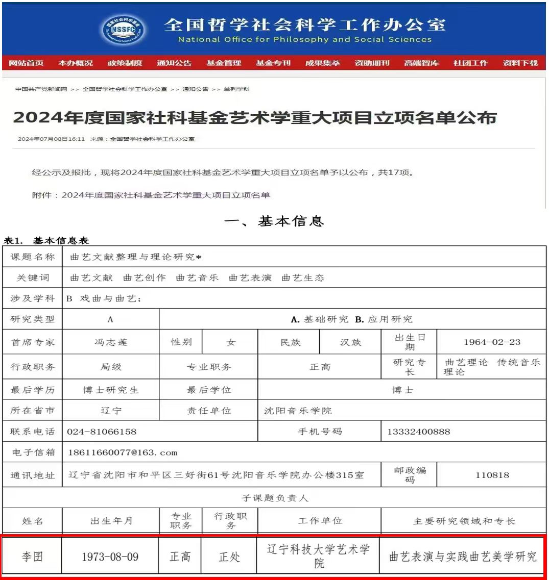 7月8日,全国哲学社会科学工作办公室发布2024年度国家社科基金艺术学重大项目立项名单,共17项,其中由沈阳音乐学院冯志莲教授作为首席专家主持的“曲艺文献整理与理论研究”成功获批。荣耀体育app最新版下载艺术学院李囝教授作为该项目子课题的负责人带领学院曲艺专业团队承担“曲艺生态与场域研究”课题研究,为项目的成功落地提供了极为有力的支撑。