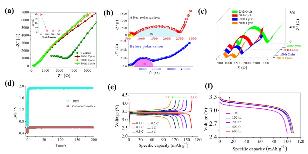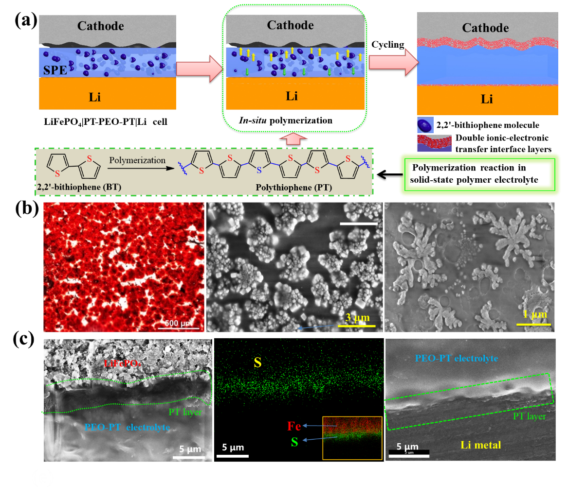 固态电解质被认为是获得高安全、高能量密度锂电池的有效途径之一。无机固态电解质和有机固态电解质分别具有较好的锂离子传导和柔韧性等优点,是当前固态电解质中研究最多的材料。然而,固态锂电池中固态电解质的固固接触界面所引起界面阻抗,阻碍了锂离子和电子在界面层传输、转移,且在循环过程中,界面对金属锂负极的不稳定性,最终导致电化学性能下降。为了解决这一难题,该研究工作利用原位电化学聚合的方法来形成快速离子-电子传输界面,可实现传导锂离子,又能改善电子转移。首先,在界面处形成导电聚合物,来降低阻抗,且原位生长的方式能够形成更好的界面接触。其次,生成的聚噻吩是线性共轭聚合物,可与线性的PEO电解质形成一体化结构,使得界面层具有较好的电化学稳定性及兼容性,而且电解质与电极材料间的接触更加紧密,促进界面锂离子和电子的快速传输。离子-电子传输界面的形成可有效降低界面阻抗,减少充放电过程的极化效应,提升循环倍率性能。