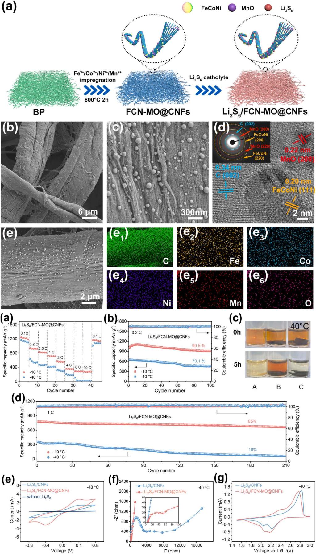 6/FCN-MO@CNFs展现了优良的低温特性,-40°C和0.1 C倍率下,初始放电容量可达1167.5 mAh g