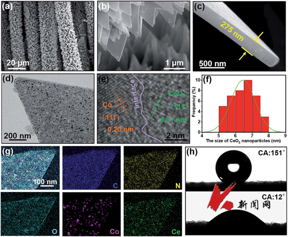 可充电锌-空气电池具有能量密度高、安全性好、环境友好等优点,被认为是一种很有前途的储能装置。然而,非贵金属催化剂在改善锌-空气阴极缓慢的氧反应动力学方面仍面临挑战。为了解决这一问题,该研究以金属-有机框架(MOF)为前驱体,采用碳化-水解过程,构建了CeO 2/Co异质结构修饰的氮掺杂多孔碳纳米片阵列垂直生长在碳布上的集成阴极。该材料独特的优势在于,首先,垂直生长在碳布上的氮掺杂多孔碳纳米片阵列电极不仅可以在不使用任何导电剂、粘合剂的情况下,直接在集流体与催化剂之间进行快速的电子转移和质量传递,而且纳米片阵列结构改善了原始碳布浸润性,避免了制备过程中的团聚现象,进而使活性位点更容易介入,增强了活性位点利用率。其次,构建CeO 2/Co异质结构从而利用CeO 2丰富氧空位调控催化位活性氧,有效提高Co物种活性位点催化效率,并且二者协同催化促进了氧反应(氧还原和氧析出)进行。该集成材料用于锌-空气电池阴极展现了优异催化性能,表现出高开路电压、比容量和倍率性能,并且在高电流密度下,具有极好的充放电稳定性。