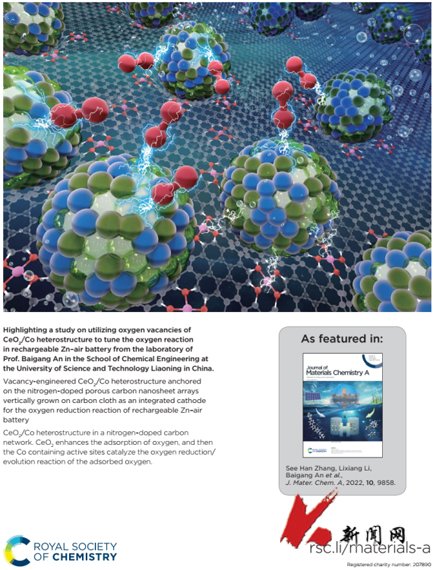 近日,荣耀体育app最新版下载化工学院“能源材料与电化学”辽宁省重点实验室在合成锌-空气电池阴极催化剂领域取得重要进展,研究成果在材料类TOP期刊《Journal of Materials Chemistry A》(IF=12.73)以封面论文 (Inside cover paper) 发表题为 “Vacancy-engineered CeO 2/Co heterostructure anchored on the nitrogen-doped porous carbon nanosheet arrays vertically grown on carbon cloth as an integrated cathode for the oxygen reduction reaction of rechargeable Zn–air battery”的研究论文。论文第一作者为2018级博士研究生李姝馨,通讯联系作者为安百钢教授,我校为唯一通讯单位。