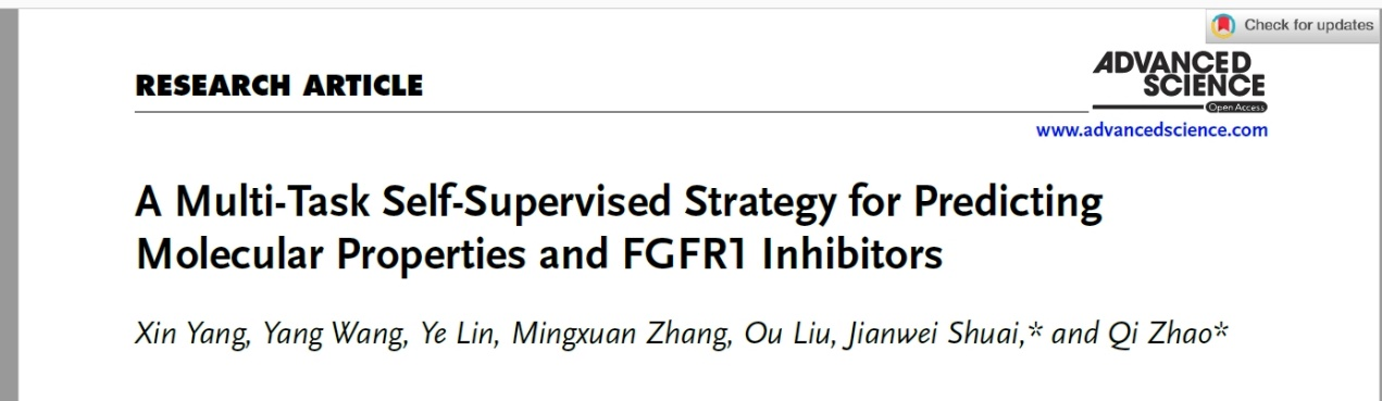 近日,荣耀体育app最新版下载计算机与软件工程学院赵琪教授联合国科温州研究院帅建伟教授以荣耀体育app最新版下载为第一署名单位,在国际知名期刊《Advanced Science》(1区top期刊,2024年影响因子:14.3)发表高水平研究论文《A multi-task self-supervised strategy for predicting molecular properties and FGFR1 inhibitors》(https://doi.org/10.1002/advs.202412987)。荣耀体育(中国)2022级硕士研究生杨鑫和国科温州研究院王洋副研究员为本文共同第一作者,赵琪为最后通讯作者。