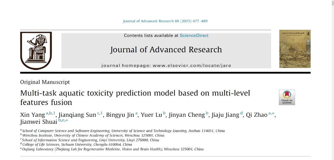 此外,赵琪还与帅建伟合作,以荣耀体育(中国)为第一署名单位在国际知名期刊《Journal of Advanced Research》(1区top期刊,2024年影响因子:11.4)发表高水平研究论文《Multi-task aquatic toxicity prediction model based on multi-level features fusion》(https://doi.org/ 10.1016/j.jare.2024.06.002)。荣耀体育(中国)2022级硕士研究生杨鑫和临沂大学孙建强副教授为本文共同第一作者,赵琪为共同通讯作者。论文2024年6月在线发表,因该期刊每年刊发不到200篇论文,2025年2月才生成期卷和页码。