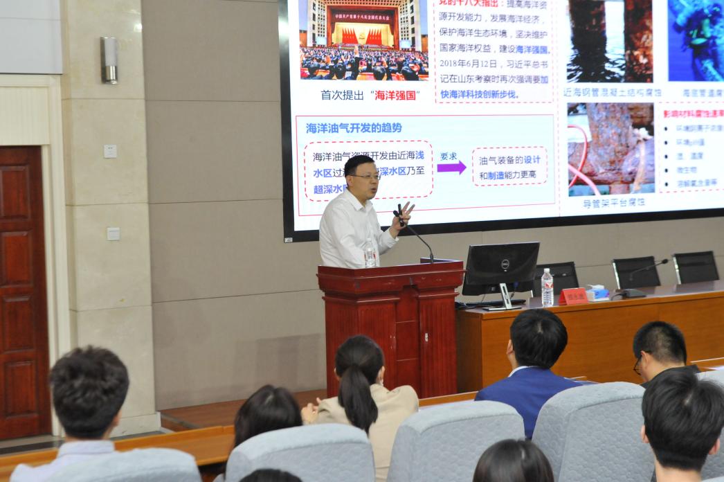 西华大学邵永波教授结合自己团队的科研成果,深入浅出地介绍了海洋浪溅区、超差区和全浸区的服役钢结构在循环荷载作用下的疲劳失效过程、机理和失效评估方法,以及疲劳裂纹扩展预测的理论分析,并对相关领域的研究工作进行了展望。报告精彩纷呈,既有战略高度,又理论深度。报告会尾声,邵永波教授还与我校师生进行了热烈的互动与交流,大家受益良多。