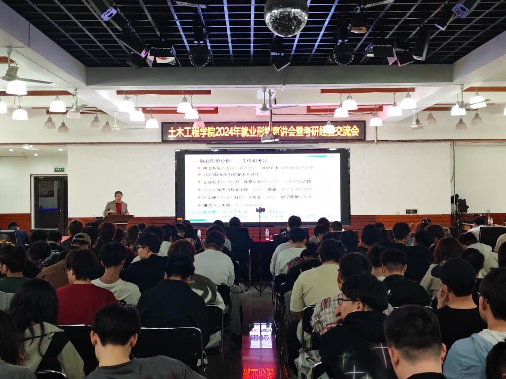 4月24日,荣耀体育app最新版下载土木工程学院在大学生活动中心召开2024年就业形势宣讲会暨考研经验交流会。学院相关负责同志、2021级班主任(学业指导教师)、辅导员和2021级学生参加会议。学生家长应邀通过线上参加。