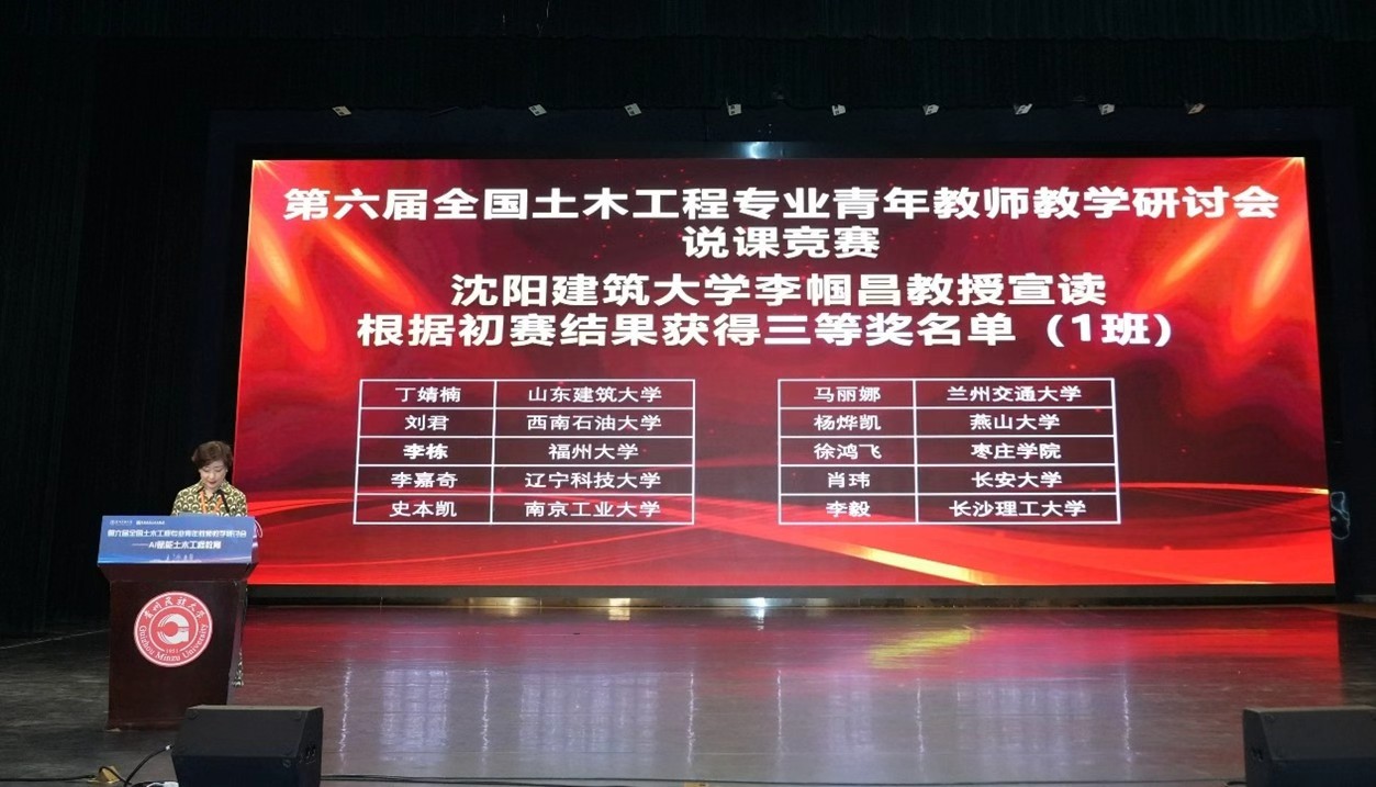 8月13日—8月15日,由教育部高等学校土木工程专业教学指导分委员会主办的第六届全国土木工程专业青年教师教学研讨会在贵州民族大学举行。研讨会期间举办了青年教师说课竞赛,以“AI赋能土木工程教育”为主题,紧密围绕土木工程专业课程的各个教学环节展开,土木学院李嘉奇和刘昱以精细的教学设计、先进的教学理念和良好的现场表达能力,在比赛中荣获三等奖。