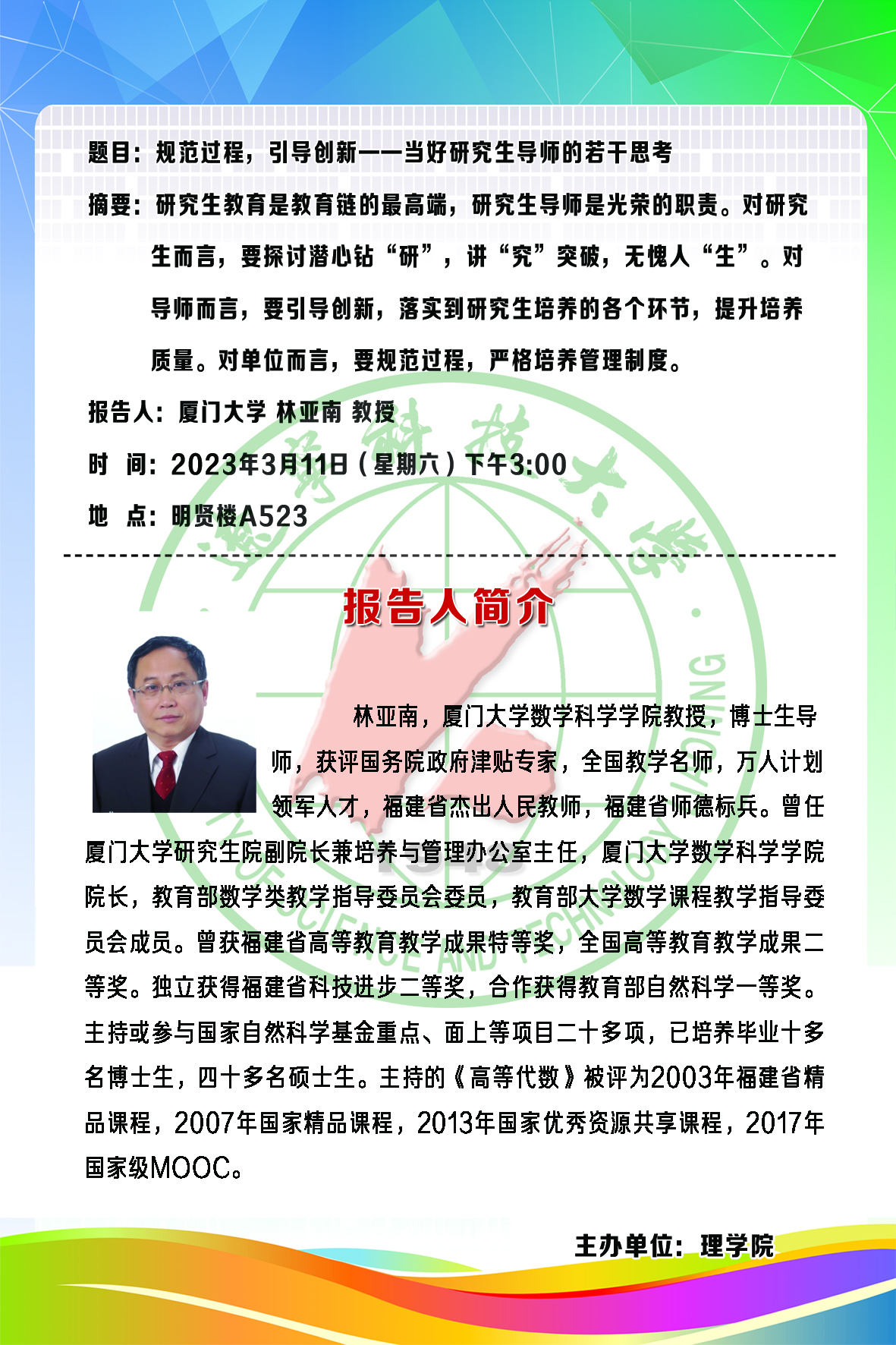 林亚南,厦门大学数学科学学院教授,博士生导师,获评国务院政府津贴专家,全国教学名师,万人计划领军人才,福建省杰出人民教师,福建省师德标兵。曾任厦门大学研究生院副院长兼培养与管理办公室主任,厦门大学数学科学学院院长,教育部数学类教学指导委员会委员,教育部大学数学课程教学指导委员会成员。曾获福建省高等教育教学成果特等奖,全国高等教育教学成果二等奖。独立获得福建省科技进步二等奖,合作获得教育部自然科学一等奖。主持或参与国家自然科学基金重点、面上等项目二十多项,已培养毕业十多名博士生,四十多名硕士生。主持的《高等代数》被评为2003年福建省精品课程,2007年国家精品课程,2013年国家优秀资源共享课程,2017年国家级MOOC。
