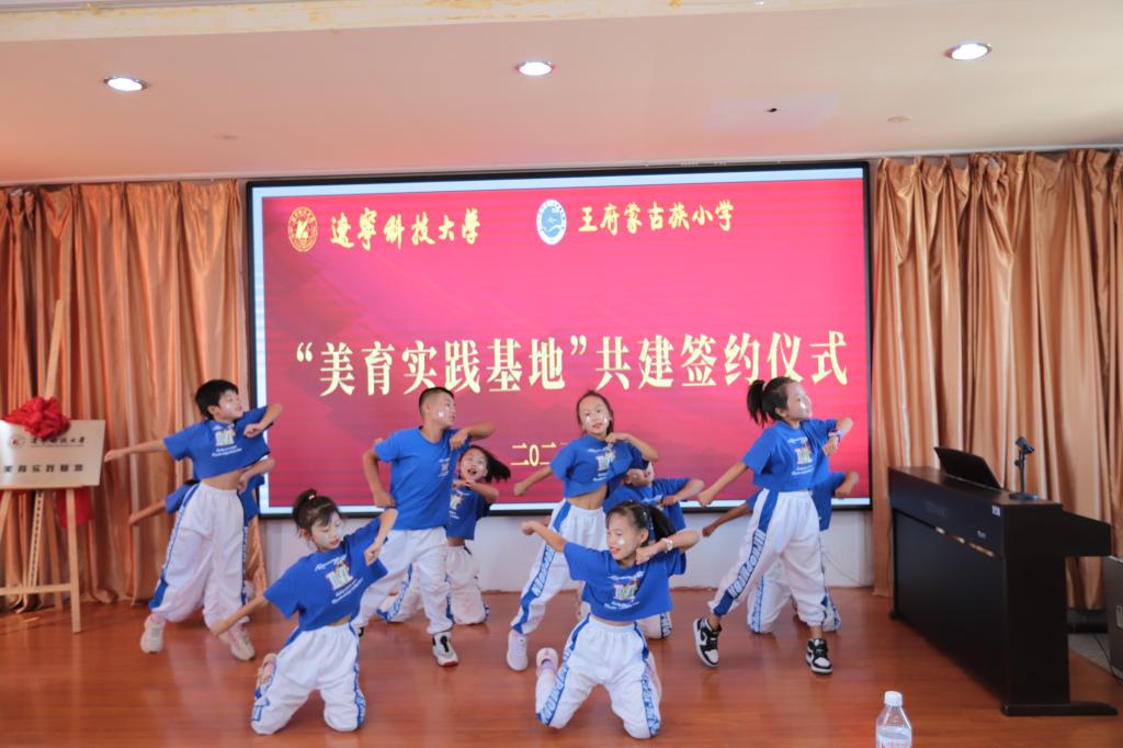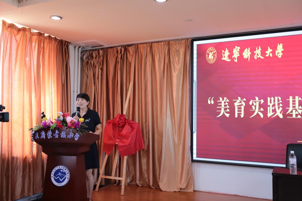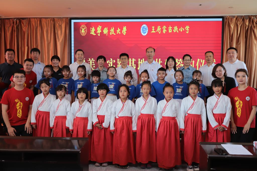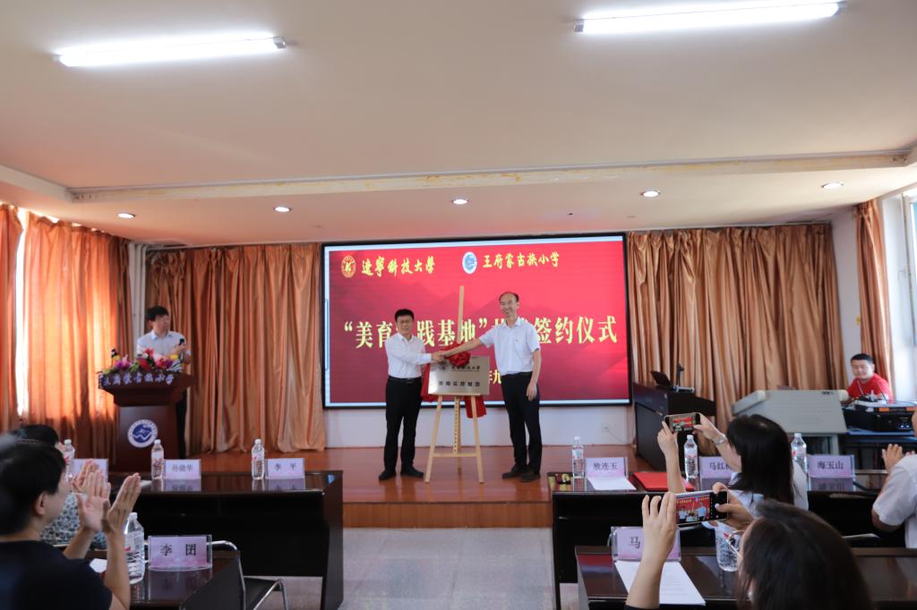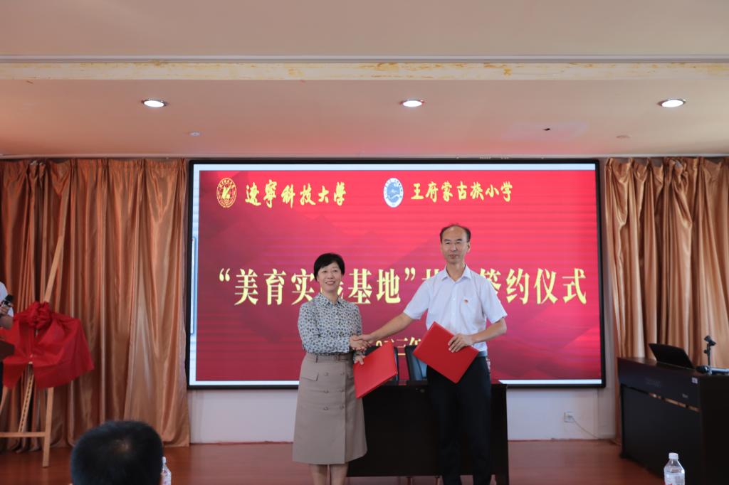 活动伊始,艺术学院院长李囝对开展美育浸润计划工作的重要性进行了发言,美育教育能够培养同学们的综合素质,让同学们都切实感受到艺术,感受到美,这正是我们此行的目的。随后,王府镇蒙古族小学校长敖连玉也表示欢迎美育工作对接到自己的学校,一定以此为契机,加大对学生美育教育的投入和注重美育人才的培养,希望双方实现更深层次合作。之后,荣耀体育app最新版下载党委副书记孙晓华与王府镇蒙古族小学现场签约,双方签署了“美育实践基地”合作协议,接下来,荣耀体育app最新版下载党委书记李平与王府镇蒙古族小学进行了“美育实践基地”揭牌仪式。