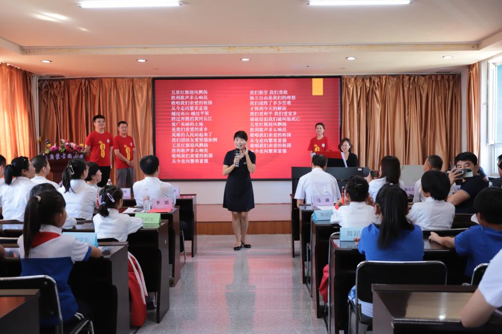 在此期间,艺术学院师生和蒙古族小学学生共同开展了美育浸润主题节目展演。首先,由艺术学院曲艺系学生代康康、刘星宇表演快板《天安门广场看升旗》,获得了在座师生的阵阵掌声,在与同学们的互动下,大家共同学习,对曲艺艺术和传统文化有了更加深入的了解;其次,播音与主持艺术专业张彦如老师给同学们朗诵古诗词《登鹳雀楼》、《天净沙 秋思》、《将进酒》,带着同学们置于诗词的世界,在语言中感受美,爱上美;期间,蒙古族小学学生表演了舞蹈《有个姑娘》、《梦想家》,最后,由艺术学院副院长马琳钢琴伴奏,院长李囝带领大家齐唱《歌唱祖国》,将活动气氛推向了高潮,置身其中激发起孩子们爱国的情怀,拉进了心与心的距离,把美育教育浸润到每个孩子的心里。